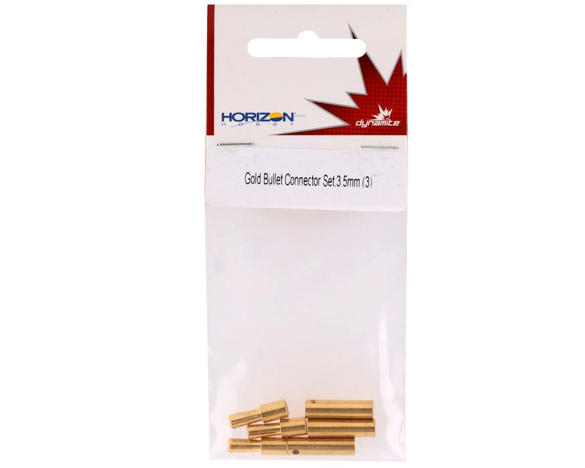 Dynamite 3.5mm Gold Bullet Connectors. These connectors are an inline connector that are great for high current use and have less resistance than a t-style connector. Package includes three male and three female bullet connectors.