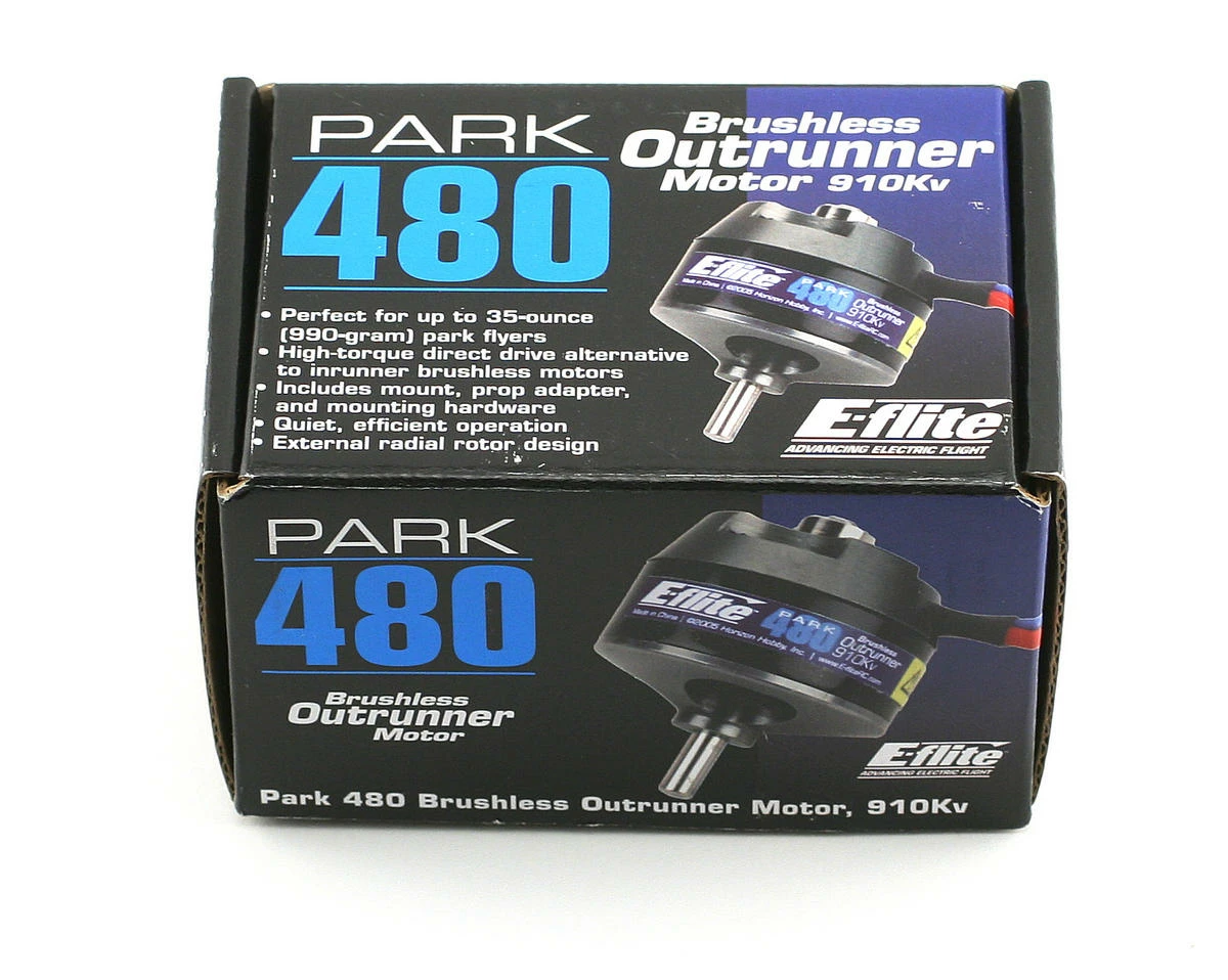 This is the E-flite Park 480 Brushless Outrunner Motor, 910 kV. The Park 480 Brushless Outrunner motor is designed to deliver clean and quiet power for 3D park flyers 20- to 30-ounces (565- to 850-grams), scale park flyers 25- to 35-ounces (710- to 990-grams), or models requiring up to 250 watts of power. It’s an especially good match for E-flite’s Mini Edge 3D ARF and Mini Funtana 3D ARF, and would provide extreme power for sport park flyers such as the Mini Ultra Stick ARF.