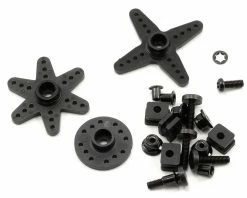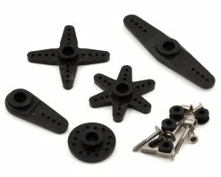 - Includes plastic star, 4 way, dual, single and round arm type servo horns and mounting hardware
