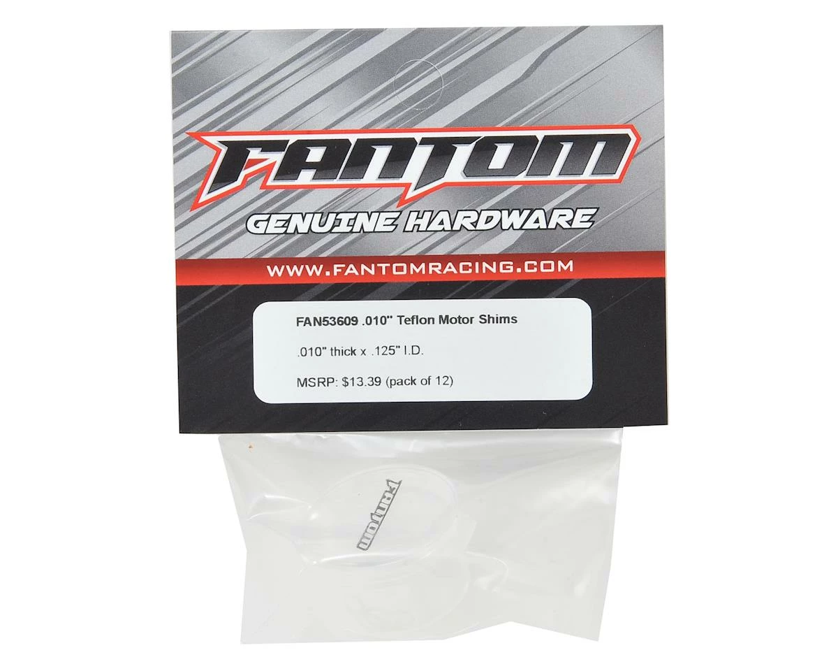 Fantom Racing .010 Teflon Motor Spacers are a must have for serious motor tweakers. Shims are a must have when rebuilding any motor, to properly shim the rotor so that it “floats” within the magnetic field. Teflon is the ultimate material for the job! Made from super slippery Teflon®, these are the ultimate high-performance shims. Use these high-performance shims to reduce RPM robbing friction due to side load drag between the rotor and bearings. These can also be used to shim your chassis to reduce unwanted end-play in the suspension arms. Package includes twelve shims.