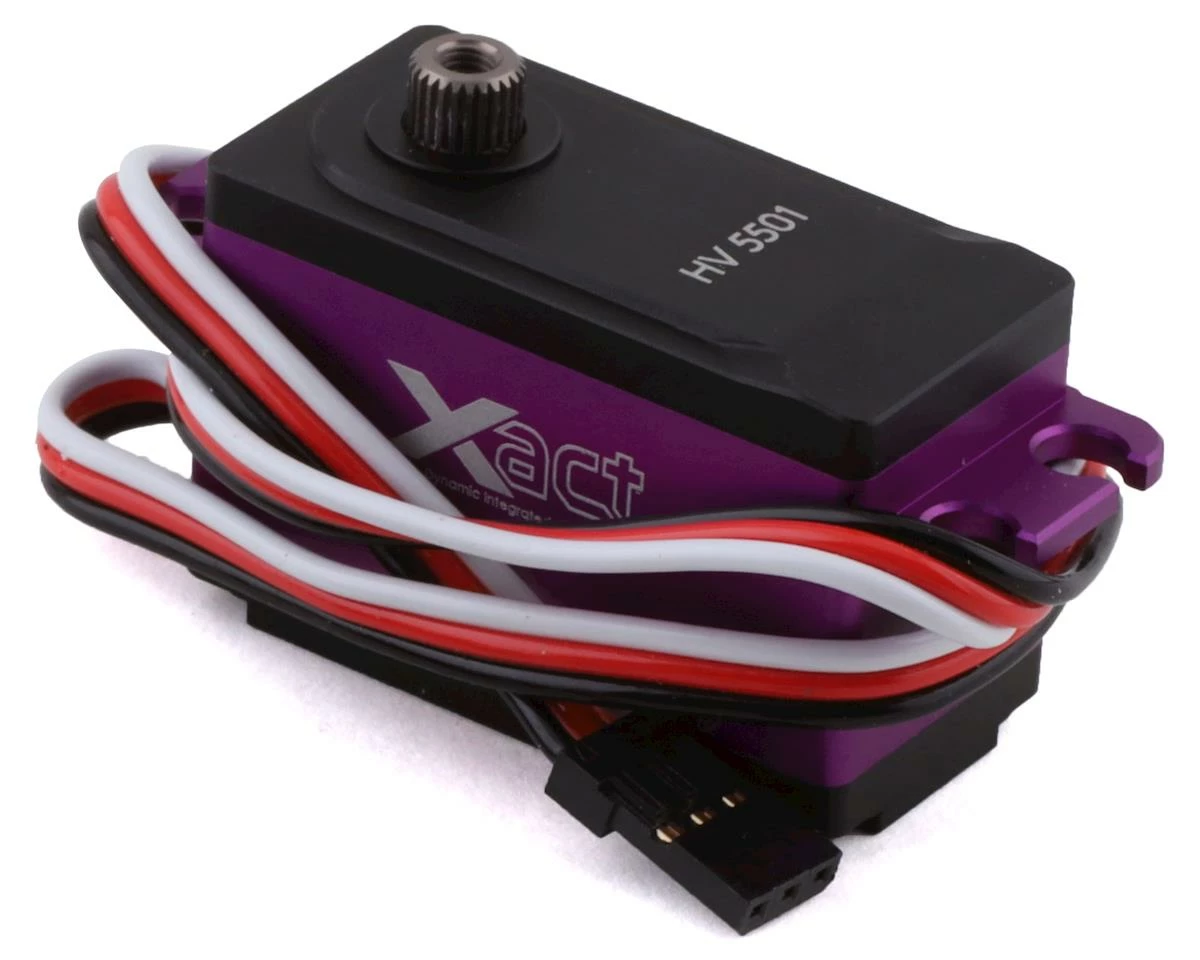 The FrSky Xact HV5501 Low Profile Servos utilize all CNC machined aluminum protective case and metal gears, these servos are 8.4V high voltage capable and offer high speed and configurable torque performance. Also, the Xact series servos offer multiple form factors and configurations to fit for different model types and precision usage.