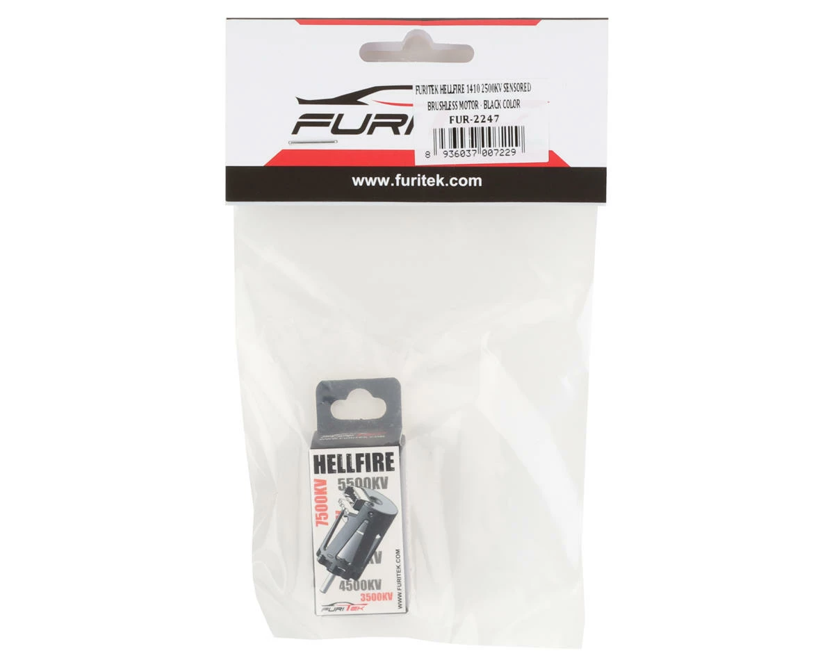 Furitek Hellfire 1410 Sensored Brushless Motor. This optional motor is a great upgrade to the Kyosho Mini-Z chassis and now features the ability to run a sensored ESC giving you smooth power delivery. The motor can has been aggressively CNC milled to remove as much weight as possible while increasing airflow keeping temps down. When paired with the Furitek Cyclos sensored ESC (not included), you can have extreme high end sensored performance with advanced tuning options. Package includes one hellfire 1410 brushless motor.