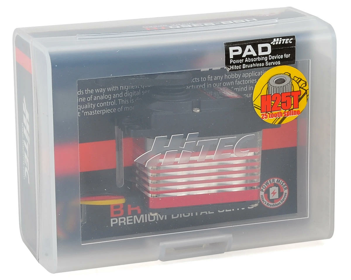 *NOTE: While compatible with most radio control devices, the regenerative braking feature of the HSB-9XXX series servos may cause a problem if the device cannot accept a backflow of current. The types of devices that cannot accept this backflow are: Voltage Regulators, Power Safe Receivers and certain BEC circuits whether stand alone or integrated within an Electronic Speed Control. Check with the manufacturer or the Hitec website for a list of compatible models. If your device cannot accept a current backflow, then you must install a PAD (Power Absorbing Device – Hitec 55756). A PAD is included with every Hitec brushless servo.