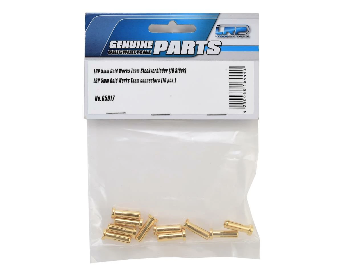 This is a pack of ten LRP 5mm Gold Works Team Bullet Connectors. These connectors are ideal for use with competition batteries that use a 5mm bullet.