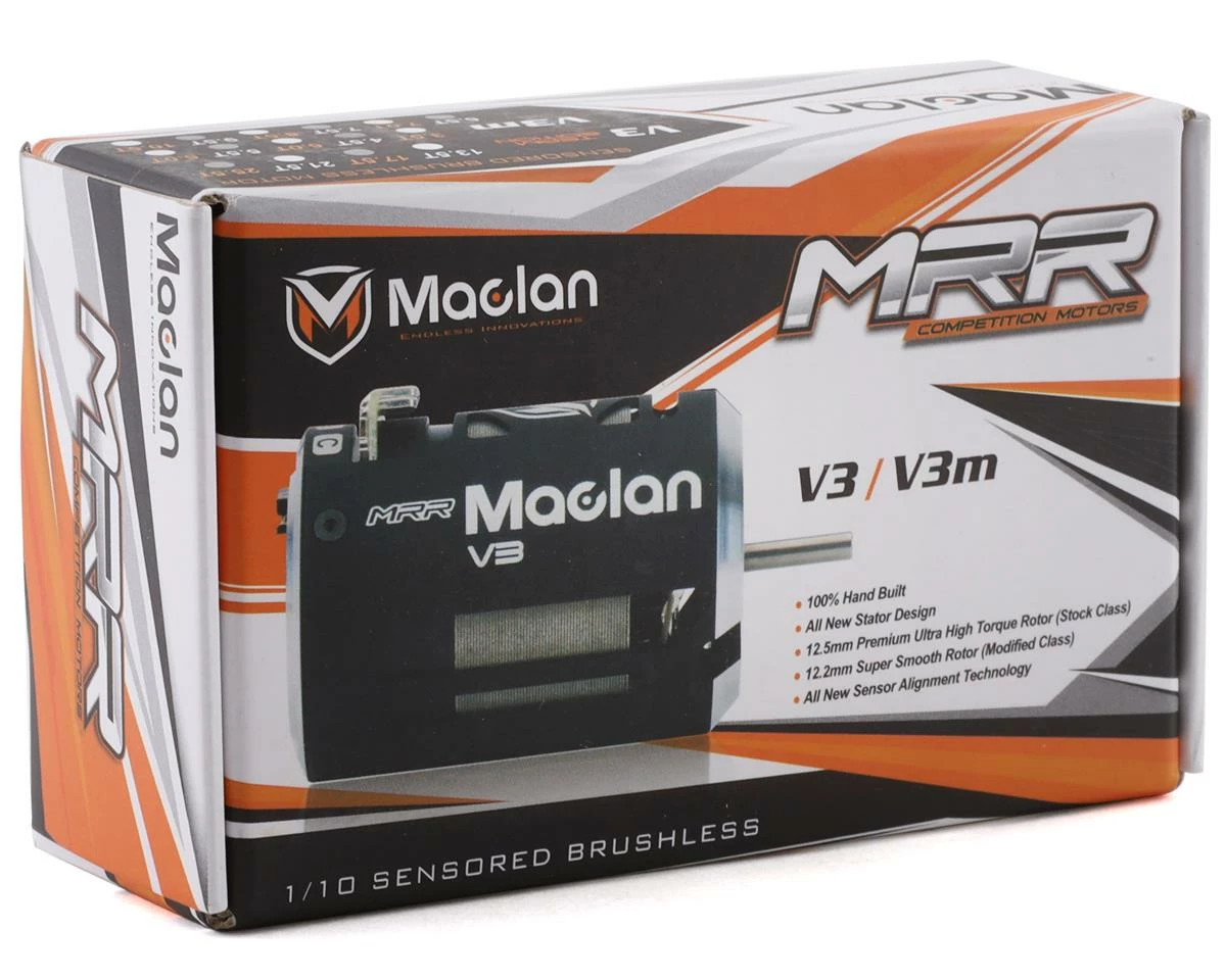 Maclan MRR V3m Competition Sensored Modified Brushless Motor. Based on the V2 platform these updated motors are ROAR approved and performance driven. Improvements in this generation are significant and will make a noticeable performance gain over previous versions.