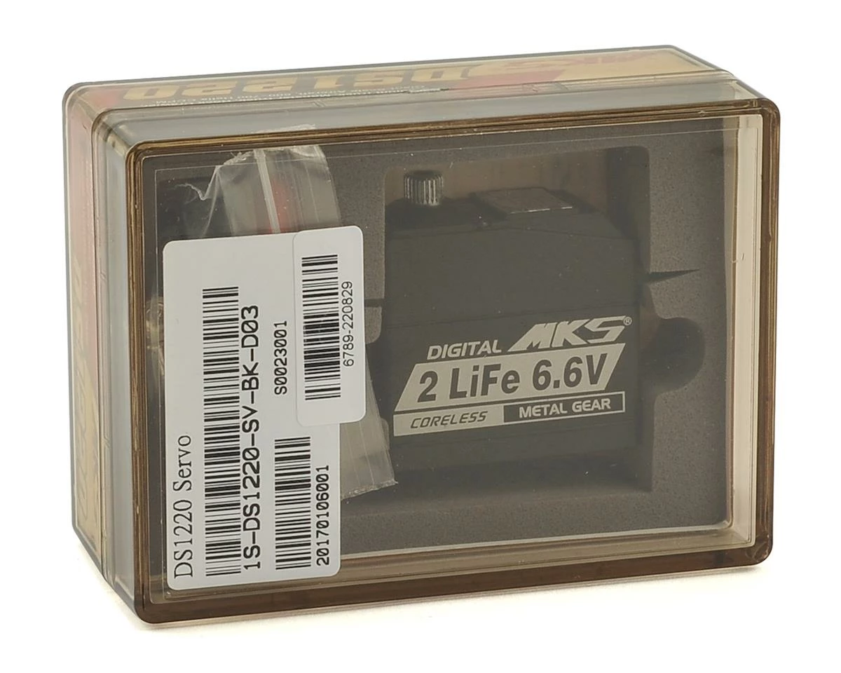 This is the MKS DS1220 Titanium Gear Ultra High Torque Standard Digital Servo. This high torque servo was developed for LiFe applications and is a great choice for 1/8 and 1/10 Scale Buggies, Monster Trucks and Rock Crawlers, Giant Scale Aircraft, and 600~700 CCPM heli applications.