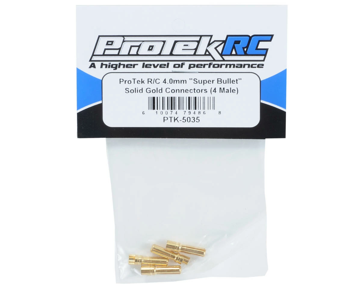 This is a pack of four male 4.0mm diameter gold plated “Super Bullet” high current inline connectors from ProTek R/C. The ProTek R/C “Super Bullet” Solid Gold Connectors are an absolute must for high current / high voltage applications! With lower resistance than a typical Dean’s style ultra plug and traditional spring-type bullet connectors, they are the new standard for brushless motor applications. They can be used for battery connectors or motor to speed control connectors. They are the ideal power connector for devices such as speed controls, battery chargers, and power meters.