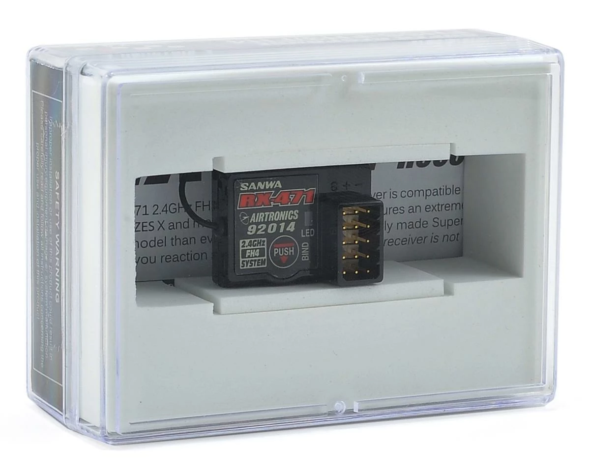 This is the Sanwa RX-471 2.4GHz FHSS-4 Surface Receiver. The RX-471 is a Super Response surface receiver that features 4-channels, FH3 or FH4 switching and 7.4V 2S LiPo compatibility. This receiver is included stock with the Sanwa M12 Competition Pistol Grip Radio System but can also be used as FHSS-3 to work with any FHSS-3 Sanwa surface radio system.