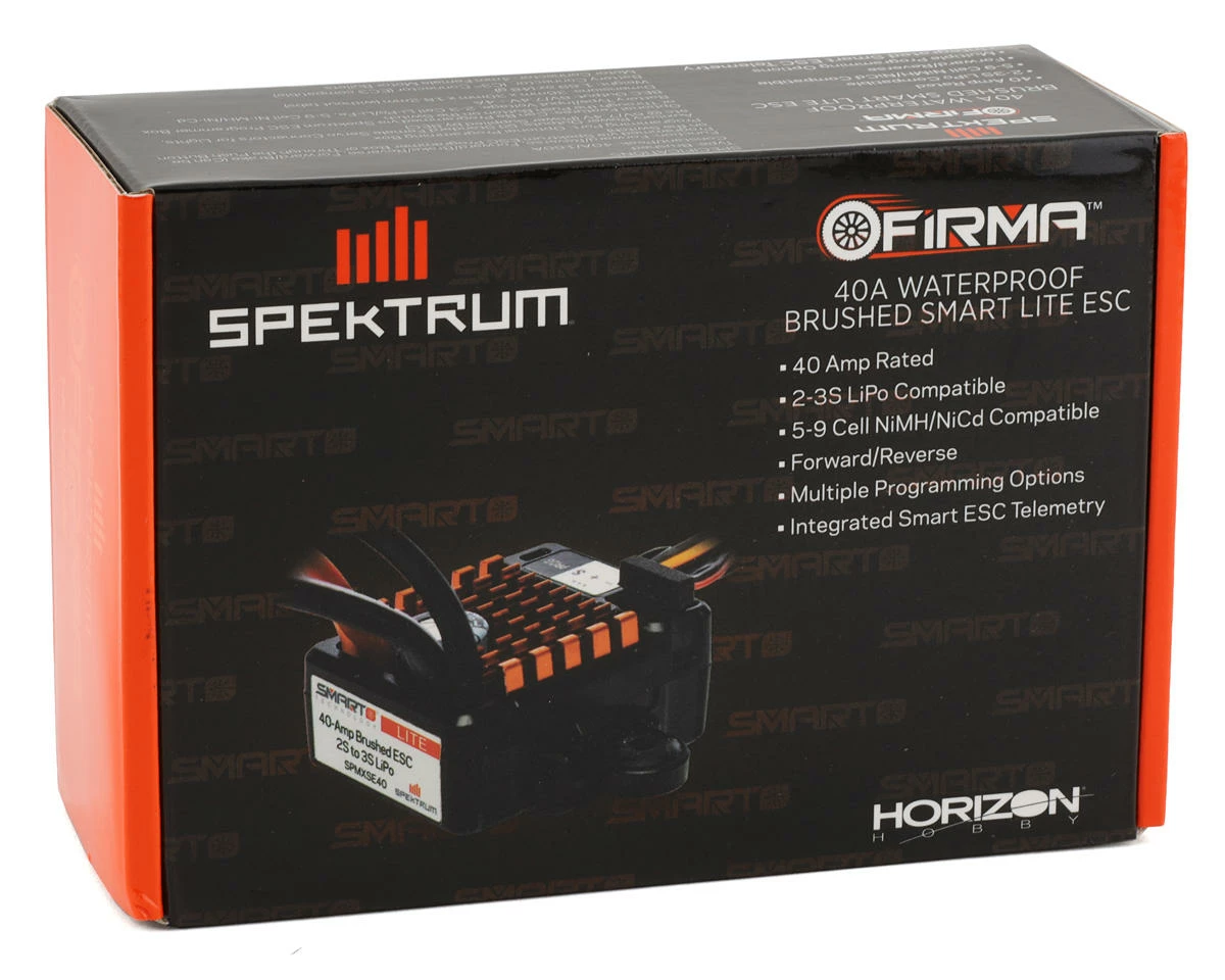 Spektrum RC Firma 40A Lite Smart Waterproof Brushed ESC. This waterproof and ready to use ESC is an excellent option for most 1/10th scale RC models. Featuring programming options that make it easy to tune for your on-road and off-road racers, scalers, crawlers, and bashers. This Firma Smart ESC is packed with features such as Spektrum RC’s SMART technology. SMART provides a one-wire solution for obtaining telemetry data such as temperature, battery voltage and capacity. Additionally the Firma 40A Lite offers a plethora of programmable tuning options giving you the utmost control over any application.