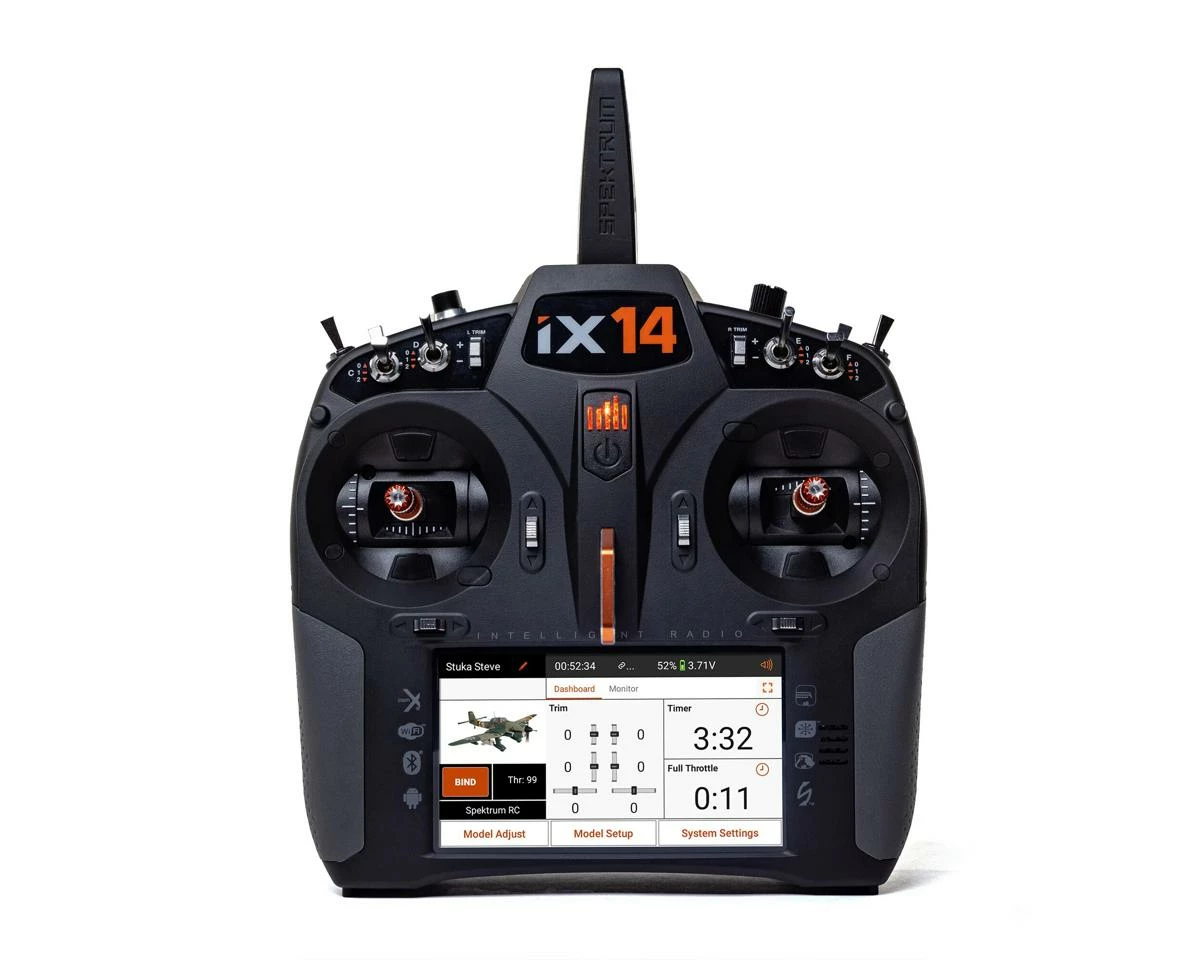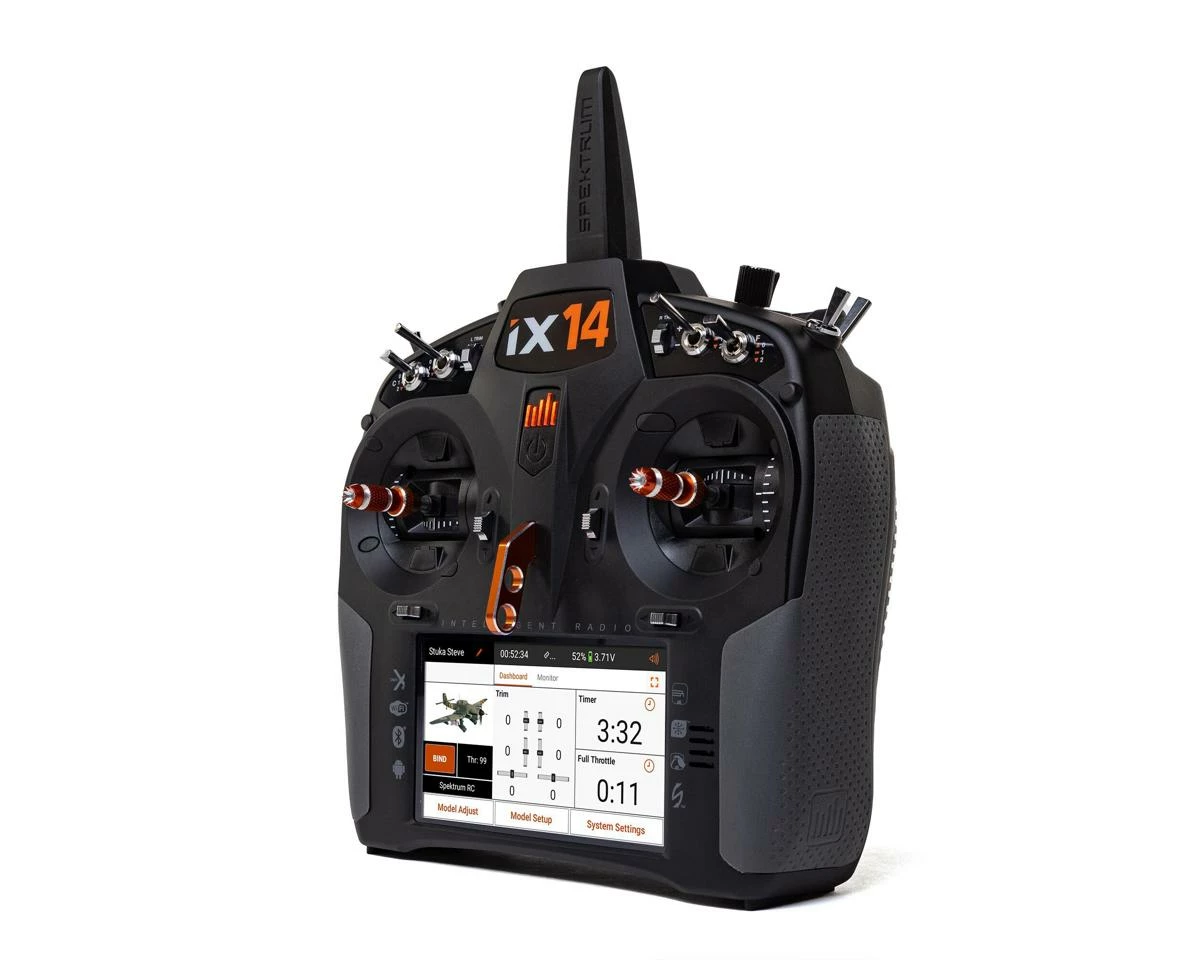 The Spektrum iX14 brings next level technology in an intelligent 14 channel transmitter system. Building off of the innovative iX series of transmitters the iX14 improves this popular Android powered platform, with not only additional program features but ergonomic features such as improved and precise hall effect gimbals. Designed to handle all model types the iX14 is a powerful “do it all” transmitter solution that will make your flying friends envious.