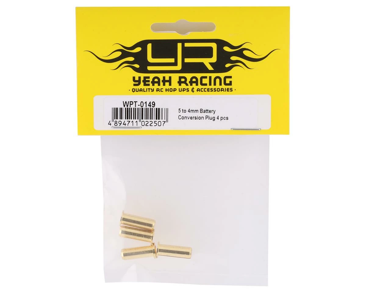 Yeah Racing 5mm to 4mm Bullet Adapter Plugs. These conversion plugs are great for plugging 4mm bullet ESC connectors into a 5mm battery. Package includes four adapter plugs.